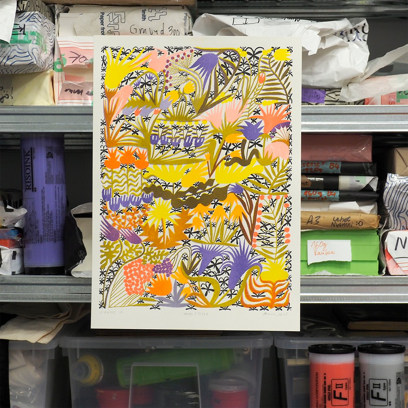 4 színű riso nyomat (yellow, fluor orange, violet és black)